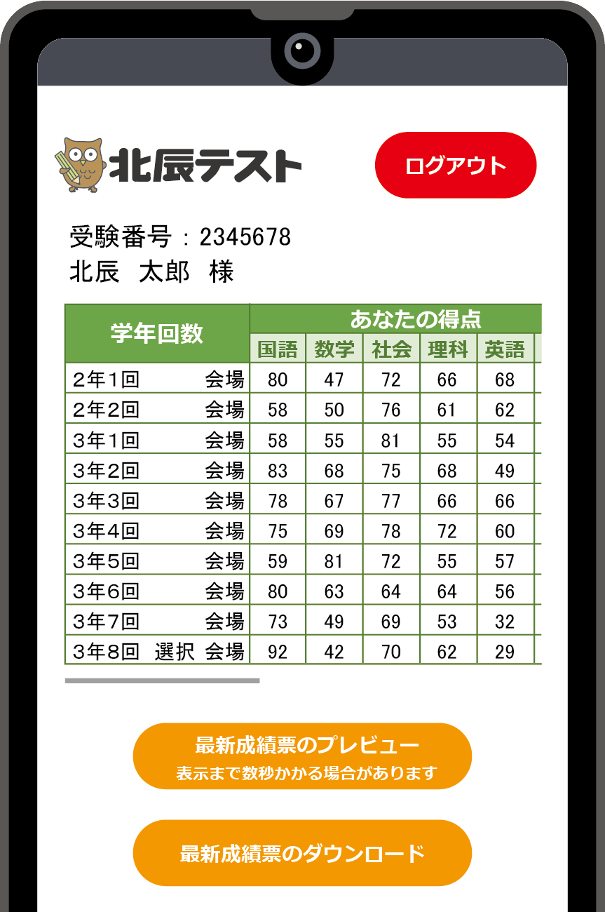 ※受験番号は、北辰マイページログイン後の画面(氏名の上)や、ダウンロードした受験票であらかじめご確認ください。