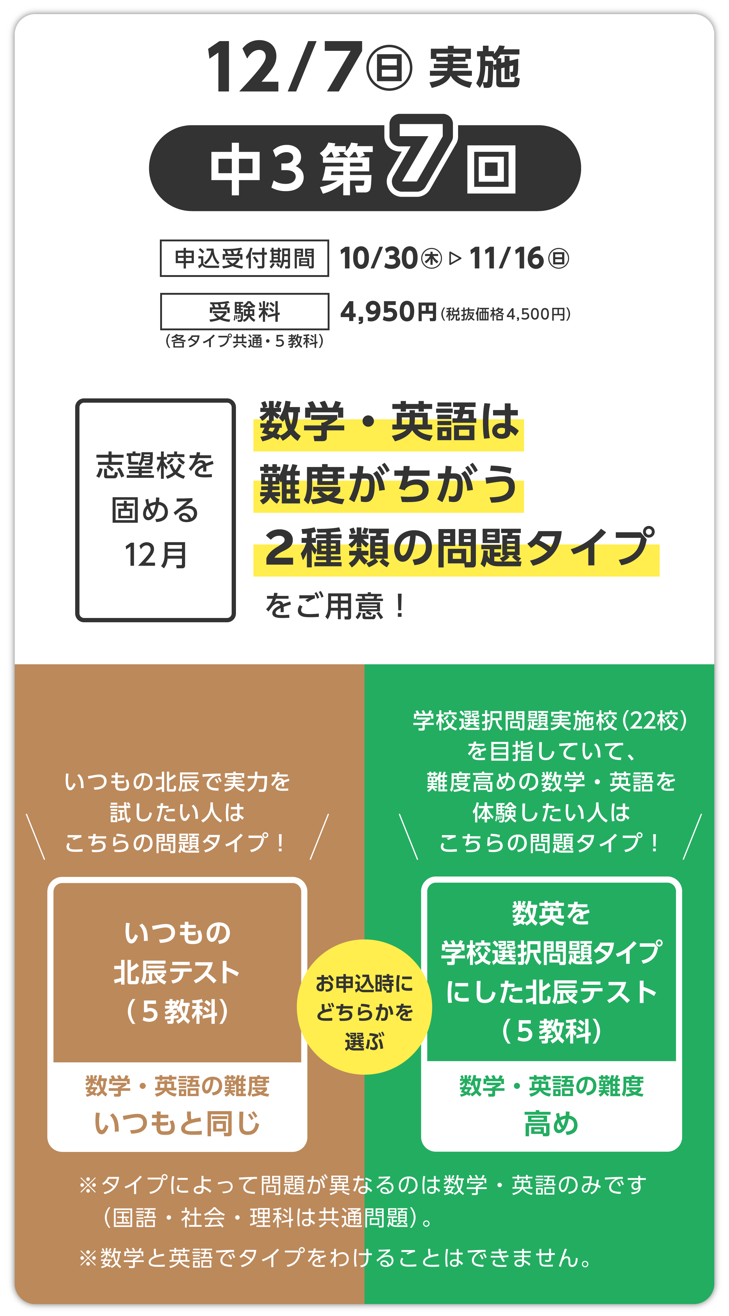 「数英を学校選択問題タイプにした北辰テスト(5教科)」をお申し込みの方はご注意ください。