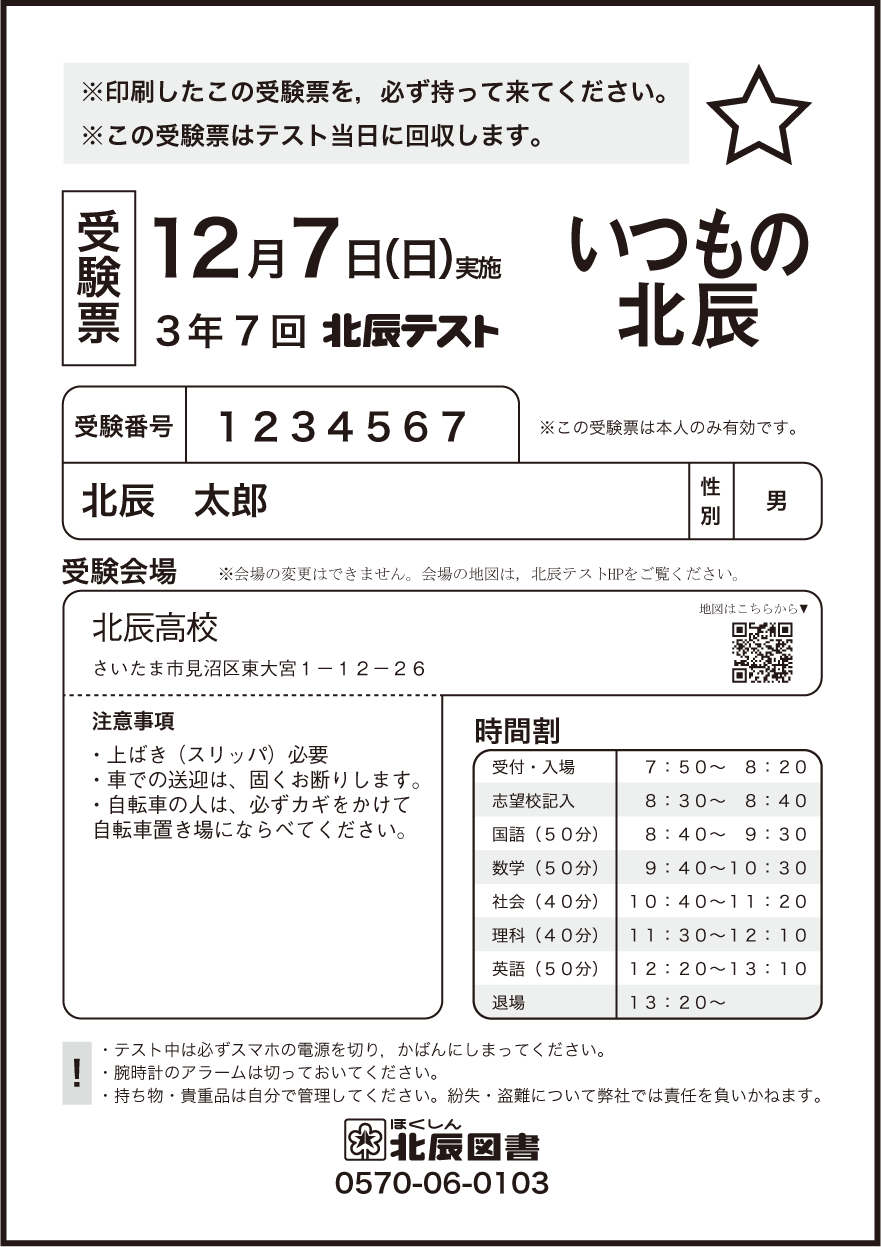 中3第6回北辰テストのお申し込みを忘れた方は、北辰図書までお電話ください。