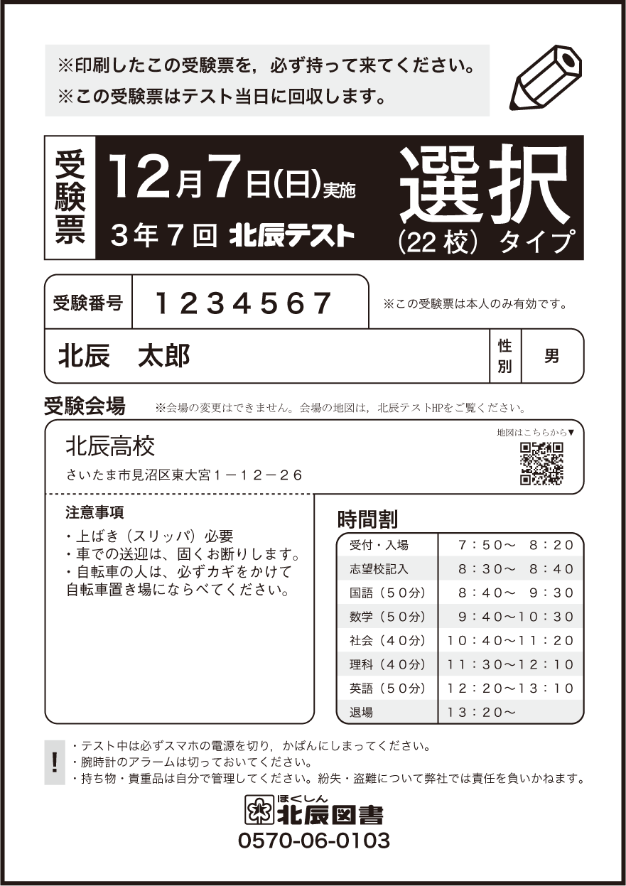 受験会場は、テスト9日前の金曜日に、北辰マイページの「申込状況と受験会場」でお知らせします。お通いの中学校ごと(男女で別の場合もあります)に会場を割り振らせていただきます。会場の変更はできません。