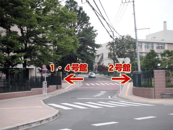 左が1・4号館入口。右が2号館入口。この坂を上った左側に7号館の入口があります。